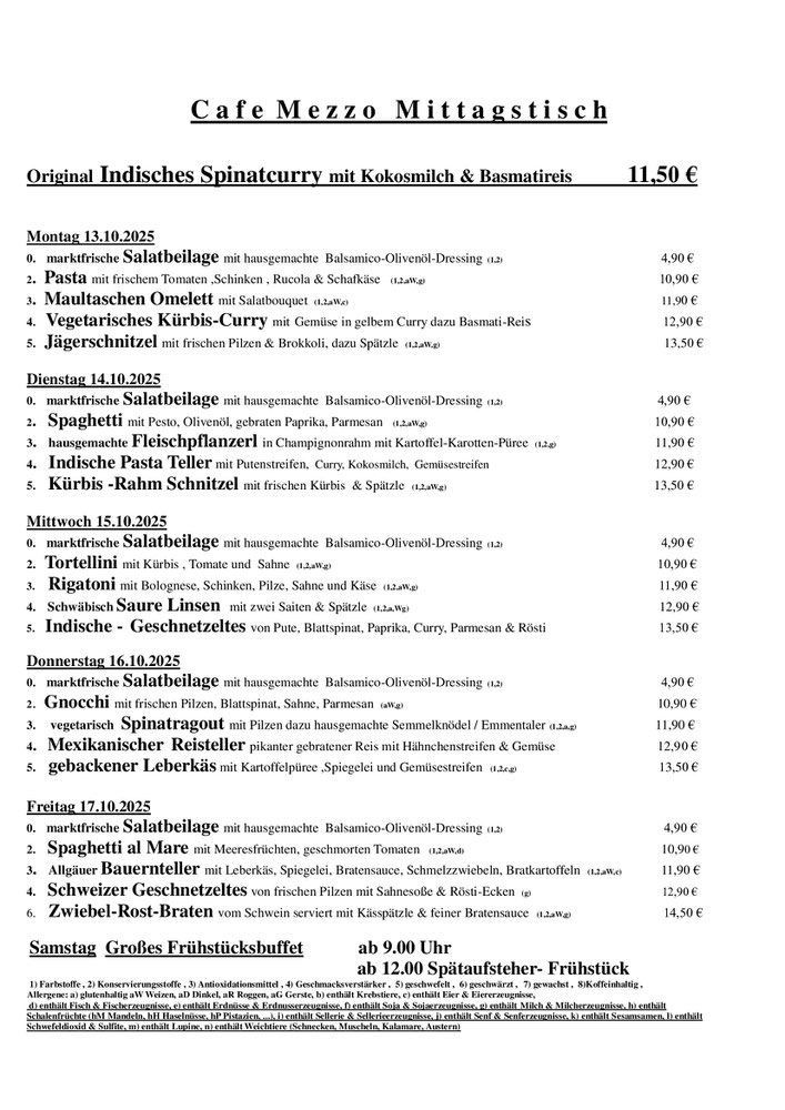 Wählen Sie aus täglich abwechslungsreich wechselnden 5 Mittagsgerichten eine Vielfalt aus Fleisch, Pasta, Fisch und vegetarischen Gerichten.